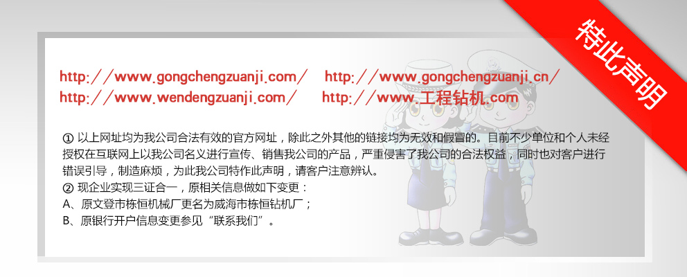 威海市棟恒鉆機廠隸屬于文登市工程鉆機廠,主要生產、銷售工程鉆機。它坐落于文登市西鋪頭工業(yè)園,這里科技發(fā)達,交通便利,制造業(yè)集中。 自1982年建廠以來,經(jīng)過多年的優(yōu)化改革和沉淀積累,擁有精密、大型加工設備近百臺的生產企業(yè)之一。現(xiàn)在研制成功的GJ-400、GJ-250S、GJ-250A、GJ-240S、GJ-240A、GJ-180S、GJ-180A型等鉆機。在其它產品上,企業(yè)建立了長期、中期、短期的發(fā)展規(guī)劃,一系列的高性能產品正在不斷推出中,企業(yè)應市場需求對系列產品進行了優(yōu)化組合,開發(fā)了與之對應配套的三腿、四腿單天車輪、雙天車輪鉆塔;泥漿泵—BW-160Q、BW- 200Q型球形閥泥漿泵大大提高了泵的使用性能和機械效率